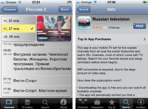 If you have an iPhone you can follow the 2012 European Figure Skating Championships in Sheffield on the Россия 2 channel on the app Russian TV. The app has a schedule, just look for the keywords: Чемпионатов Европы (European Championships) to find out broadcast times. This is the same channel that provides the internet stream. All commentary is, of course, in Russian.