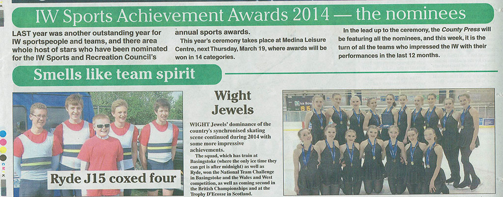 Wight Jewels have joined the ranks of ice skaters nominated for the 2014 Isle of Wight Sports Achievement Awards. They were included in the list of nominees for the teams published in the Isle of Wight County Press on Friday (and keen-eyed readers will note that the capacity for a local paper to muddle facts is astounding).