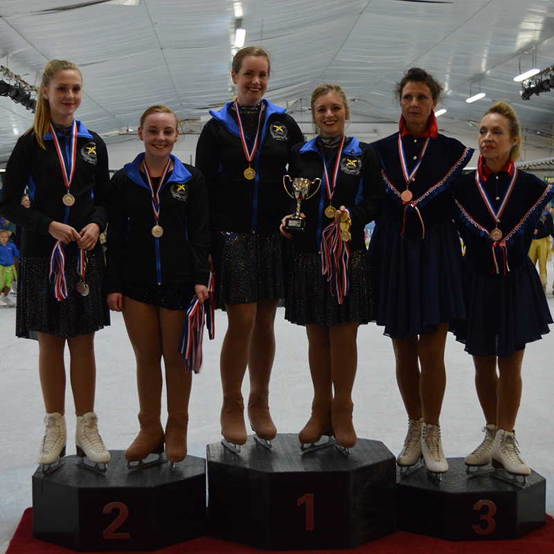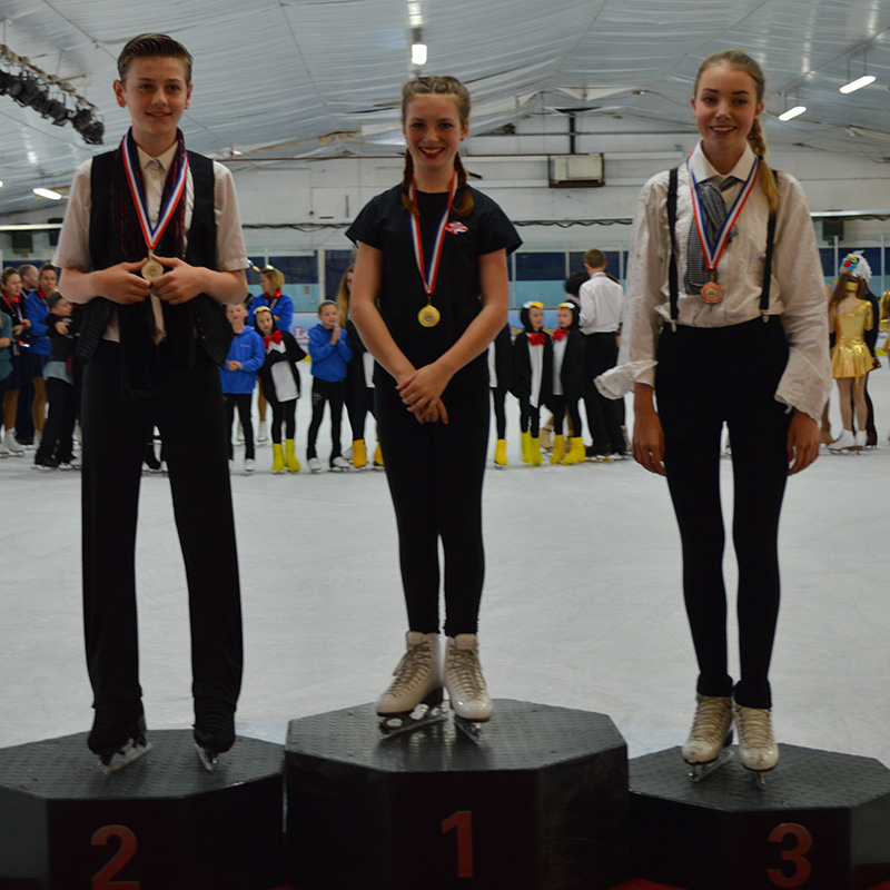 The artistic competition was preceded by the Sue Buckingham Memorial Trophy, which saw the clubs’ synchronized skating teams in action: Gosport AllStars and Shooting Stars, and the Wight Sparkles and Fossils. The Sue Buckingham Memorial Trophy is contested in memory of ice skating judge Sue Buckingham. Sue was a regular member of the select group of judges who very kindly make the effort to come across to the Isle of Wight to officiate at club competitions.